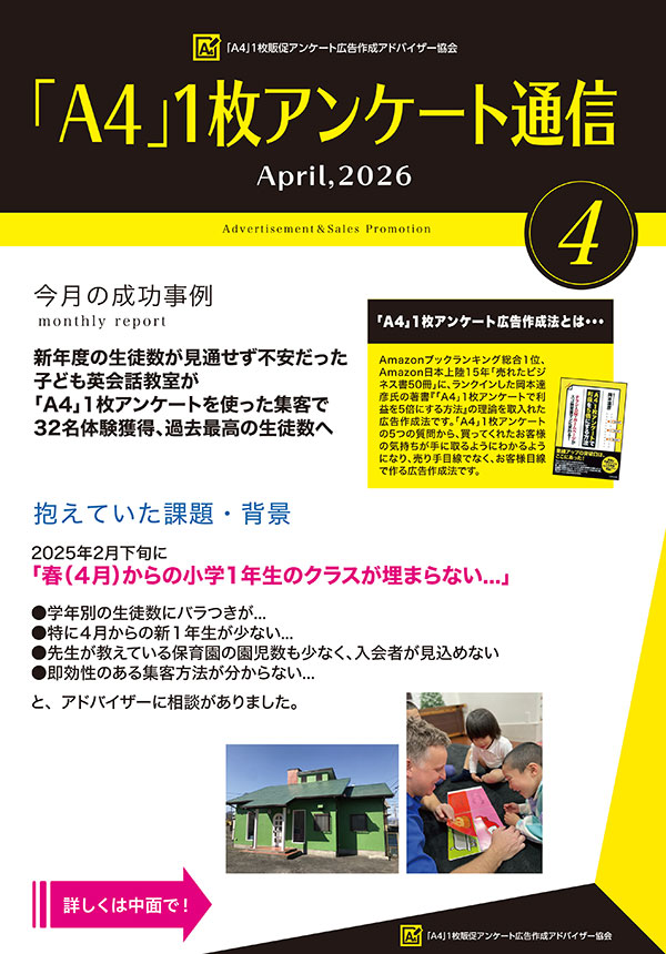 「A4」1枚アンケート広告作成法にご興味がある方は、下記よりお気軽にお問合せください。